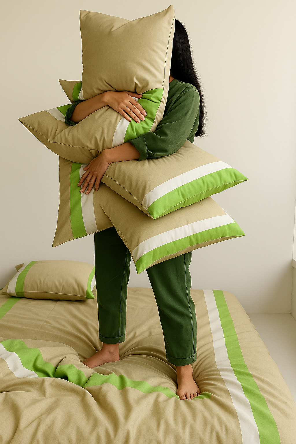 🌿 A huzat színvilága – a zöld, bézs és halványkék harmonikus kombinációja – nyugalmat, természetességet és frissességet sugároz. A zöld a természet közelségét idézi, a bézs semleges alapot teremt, míg a halványkék hűsítő hatásával tovább fokozza a nyugodt, pihentető légkört a hálószobában. Ez a színösszeállítás könnyen illeszkedik modern, minimalista vagy természetközeli enteriőrökbe is.